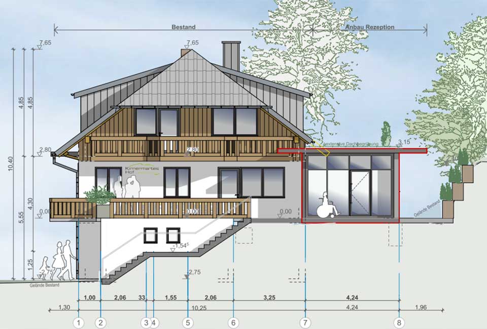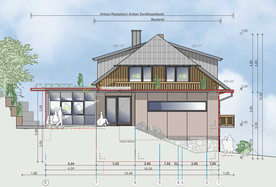 Erweiterung von bestehendem Sanitärgebäude mit neuer Rezeption und Gastrobetrieb