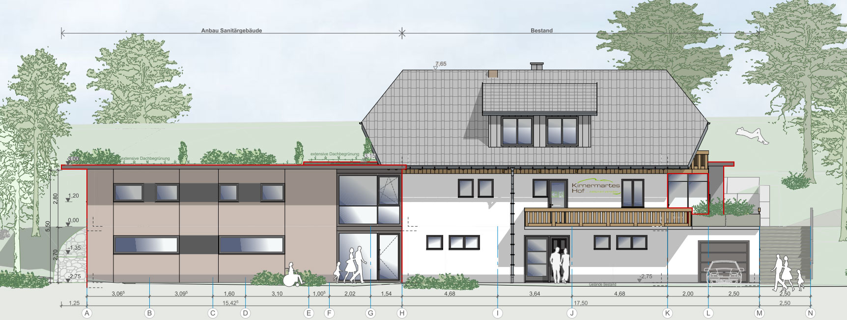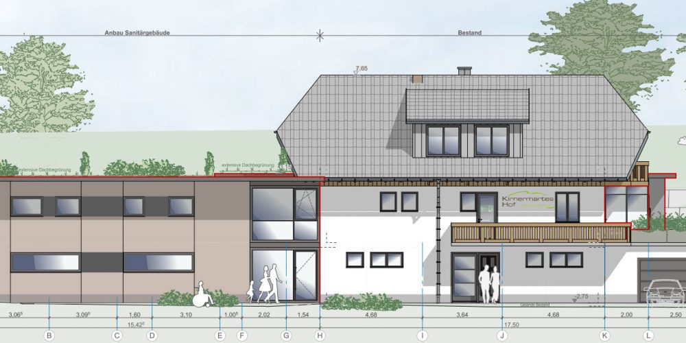 Erweiterung durch einen zweigeschossigen Flachdachanbau an das bestehende Sanitärgebäude, mit neuer Rezeption und kleinem Gastronomiebetrieb. Der Kirnermarteshof hat mehrere Standbeine: